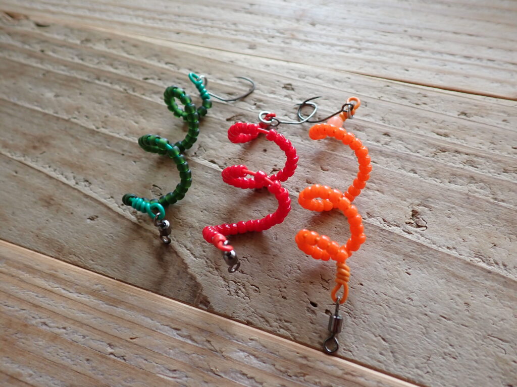 ビーズ素材と針金でできた本体が、リトリーブするとぐるぐると回転する。動きはかなり独特で、アクションというより「異常に目立つ何かが回っている」という状態。